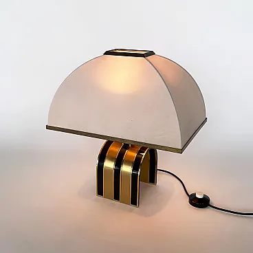 Table lamp by Romeo Rega, 1970s. Satin-finished solid brass frame with black lacquer and fabric lampshade. Dimensions: 42 x 28 x 47h cm. Bulb not included. Slight signs of wear consistent with age and use. Very good condition.