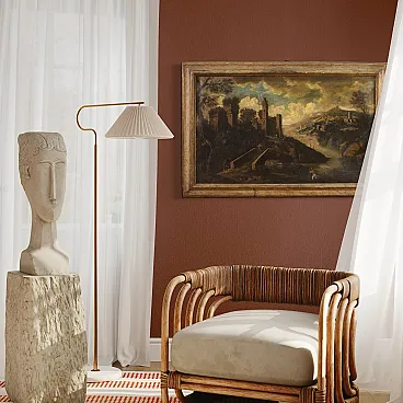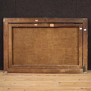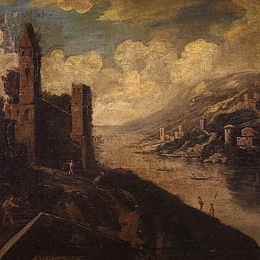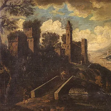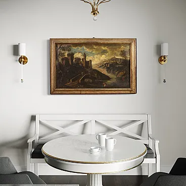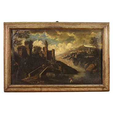Ancient Italian painting by the mid -eighteenth century. Oil work on canvas depicting landscape with characters and architecture along the river, of good pictorial hand. Finely carved, golden and lacquered ancient wooden frame of pleasant decoration and in beautiful patina. Picture that develops horizontally, of pleasant depth, for antique dealers and furnishings. Over time, it has undergone a patina that has undergone a conservative restoration intervention, come to the color of color in some places (see photo). On the original frame, painted overall in good conservative state with some sign of the time. Painted light H 65 x L 108 cm.