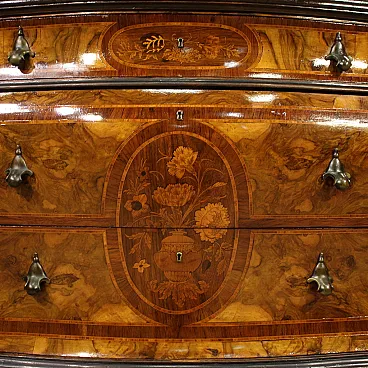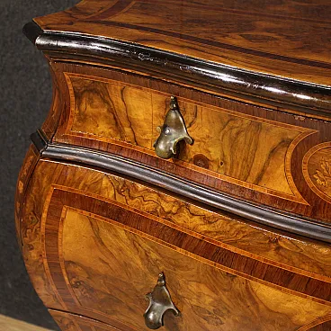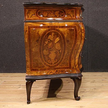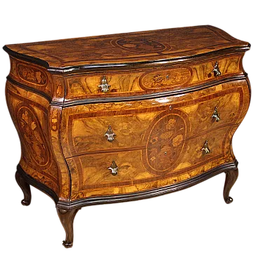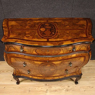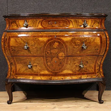 Lombardo Veneto drawer from the mid -twentieth century. Mobile and bombed mobile, in the Louis XV style, finely inlaid with floral decorations on front, floor and hips, of excellent quality. Desclified and inlaid dresser in walnut, root, bois de rose, maple, ebanized wood and fruit woods. Mobile equipped with three capacious drawers and upper floor wooden in character (see photo). Room or living room, fabulous furnishings, for antique dealers and furnishings. Mobile belonging to a complete room of bedside tables, double bed, toilet and two -door wardrobe (request the price in bulk, if available). Board of excellent stability, supported by four solid feet with curl decoration (see photo). Original cherry interiors (see photo). Mobile in good condition.