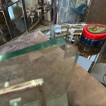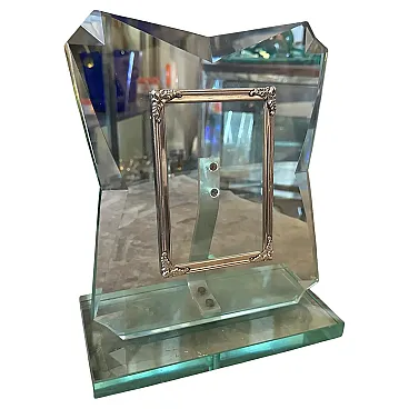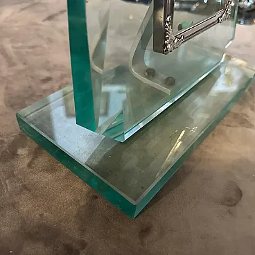 This high quality Mid-Century Modern picture frame is made of Verde Nilo glass, a distinctive green-tinted glass often associated with high-end Italian glasswork from the mid-20th century. The frame features a geometric, angular silhouette with faceted edges that catch and reflect light, a hallmark of Fontana Arte’s style, It is constructed from thick Verde Nilo glass, known for its pale green hue and luxurious appearance. The glass is polished to a high sheen and appears quite solid and heavy, the central photo holder is framed with a delicate metal trim, possibly silver plated brass, with ornate floral embellishments on the corners. This adds a touch of elegance and vintage flair. The frame is supported by a matching glass pedestal base, which provides stability and complements the overall aesthetic. Firmly rooted in Mid-Century Modernism, this piece reflects the sophisticated, minimalist yet decorative tastes of the 1950s Italian design scene. This kind of frame is not just functional but also serves as a decorative art piece, making it a collectible item especially among vintage and design enthusiasts. It's in perfect condition.