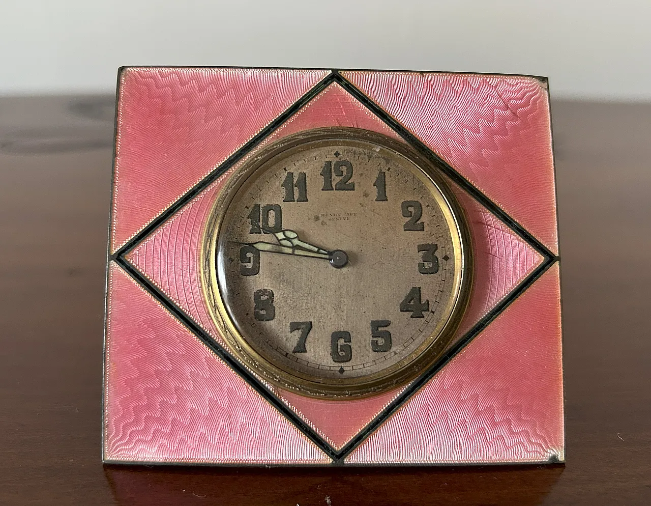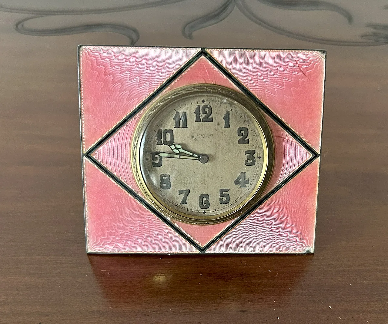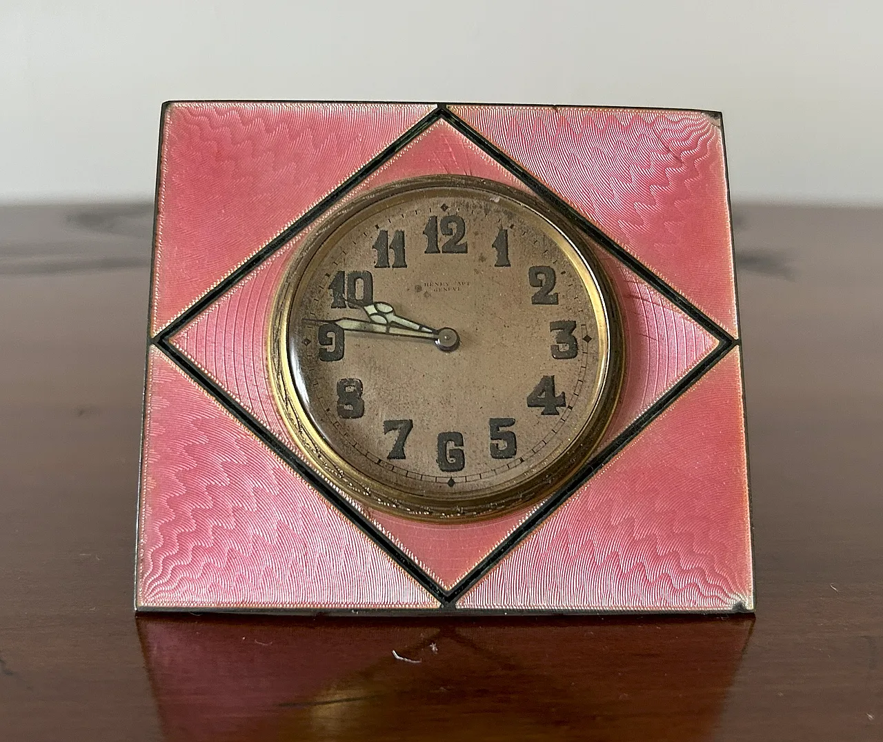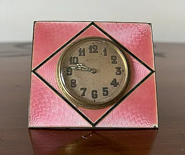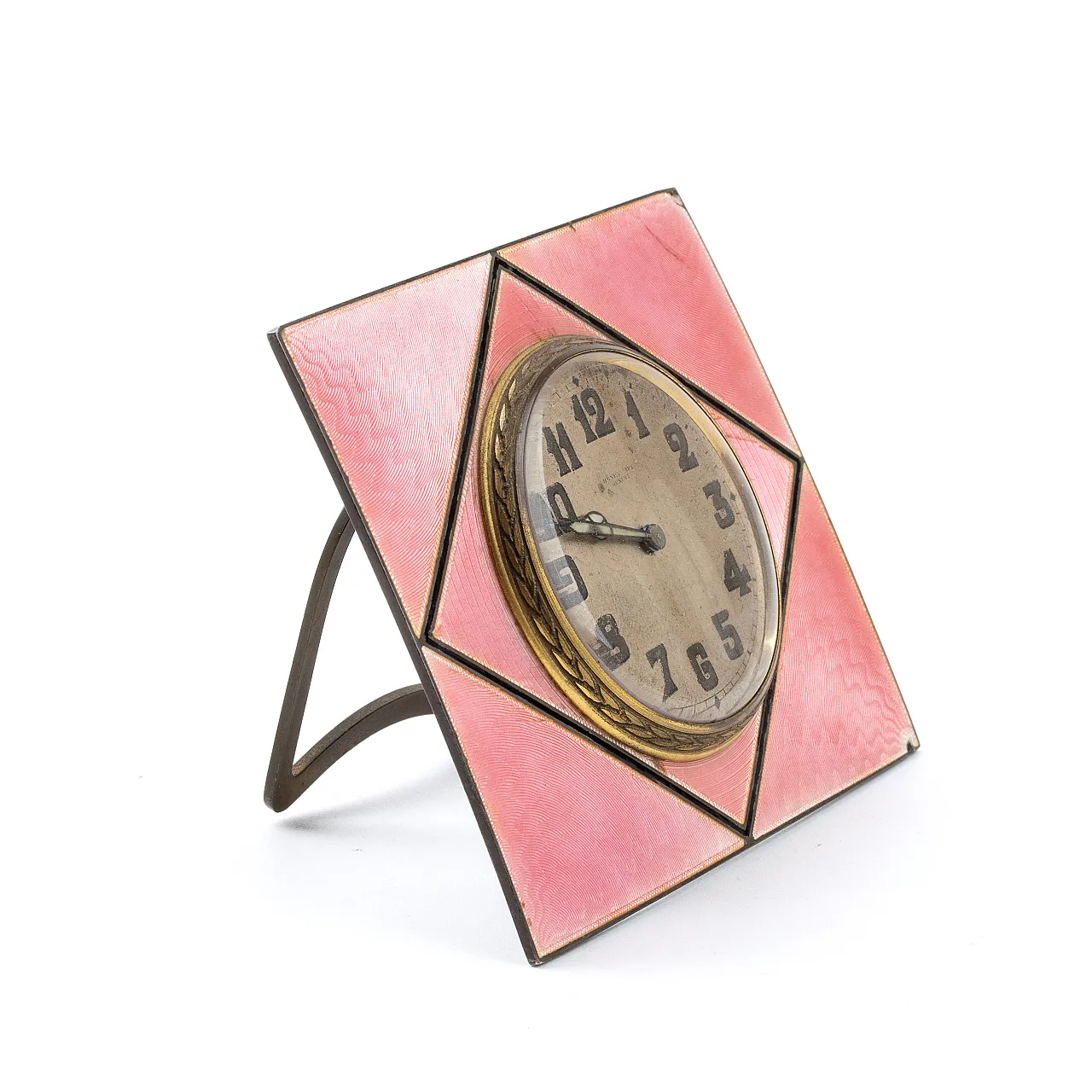 Square crate in hormulu decorated with geometric motifs with glazes guilloché in tones of pink and black enamels.