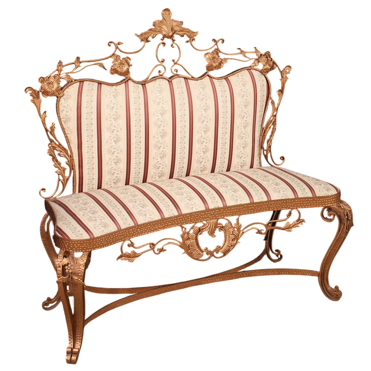 Italian sofa of the 60s. Mobile in golden metal (bronze color) and chiseled Italian design in the Pier Luigi Colli style with floral decorations of great pleasantness. Sofa with seat and back covered in fabric with flowers in good condition. Height at the session of 46 cm. Furniture of beautiful extent and proportion easily insertable in different points of the house. Sofa supported by four solid legs moved with central crossbar adorned with double curly feet (see photo). Mobile belonging to a set also consisting of two seat (see photos and request the block price if available). In good condition.