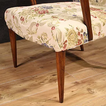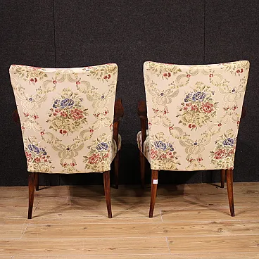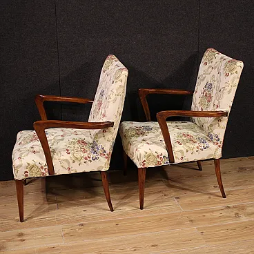 Couple Italian armchairs of the mid -twentieth century. Furniture carved in beech wood and covered in floral fabric of good taste and great pleasantness. Chamber or living room armchairs, of beautiful extent and proportion, for antique dealers and furnishings. Height at the session of 40 cm, of good convenience. Spring padding in good condition. Armchairs of discreet solidity, complete with armrests and four wooden feet of which the rear ones, a saber (see photo). Fabric in good condition, without spots or tears. Ideal armchairs for a bedroom, not suitable for excessive daily use or to bear too large a weight. Overall furniture in good condition.