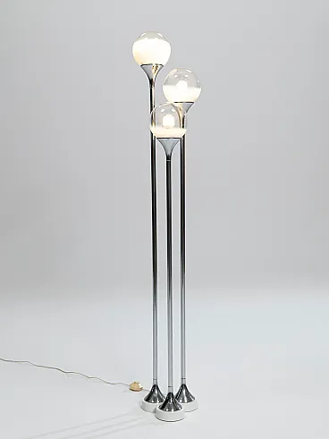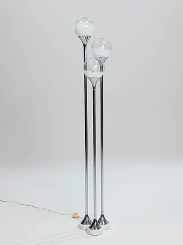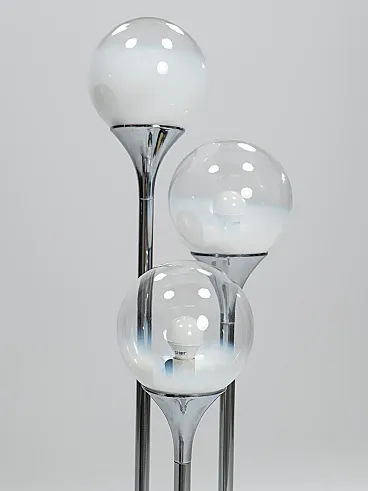 This fascinating land lamp produced by Targetti has a delicious design, and does it three times. Starting from the bottom, the chrome base of the lamp compresses in a thin column that rises and threw to accommodate a graceful glass globe of 17 cm in diameter. The lower part of the globe is bleaching, in order to project a diffused light on the sides and a light light upwards. Multiplying everything by three, at different heights, you get an enchanting result to say the least. The lamp is fully functional and turns on and turns off via the pedal switch.