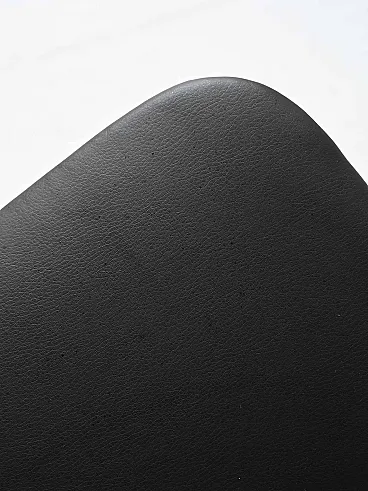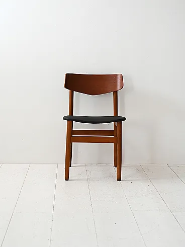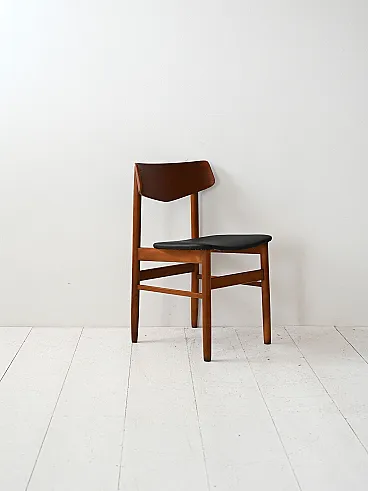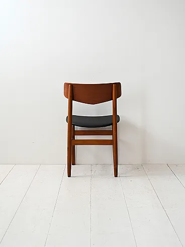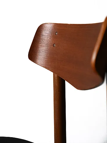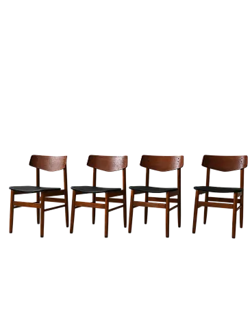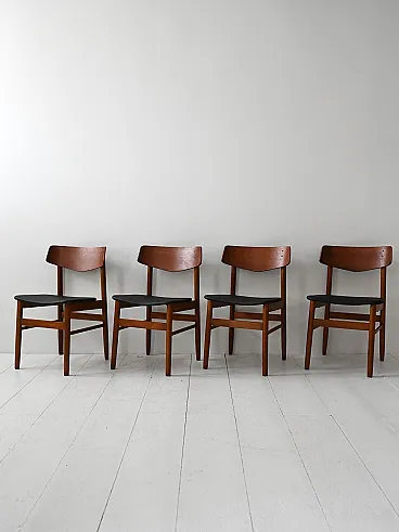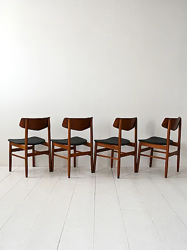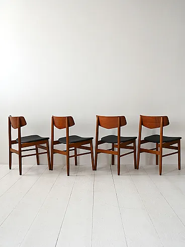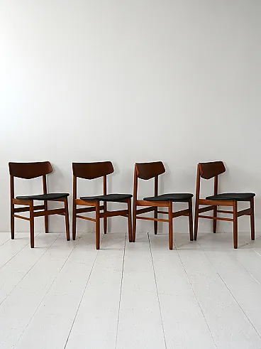 1950s/60s teak chairs with black leather seat. Net lines and essential Nordic taste. Four Scandinavian chairs made between the 1950s and 1960s, characterized by a teak structure and a clean silhouette. The contrast between the warm wood and the black leather seat recalls the sober aesthetic of the Nordic design of the mid -century. The shaped back offers support and a dynamic visual line. Good condition. They could present signs of time. Pleasure pay attention to the photographs.