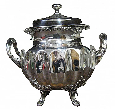 Small antique silver-plated metal soup tureen with lid. Silver-plated metal, four layers of silver. Hallmarked underneath: ADELPHI SILVER PLATE CO. NEW YORK 666 QUADRUPE PLATE + COAT OF ARMS. The mark designates the period between the end of 1800 and the beginning of 1900. Letter G engraved in the upper part, two handles, wavy feet with workmanship, lid with knob on top, cleaned and in excellent condition, of fine workmanship.
