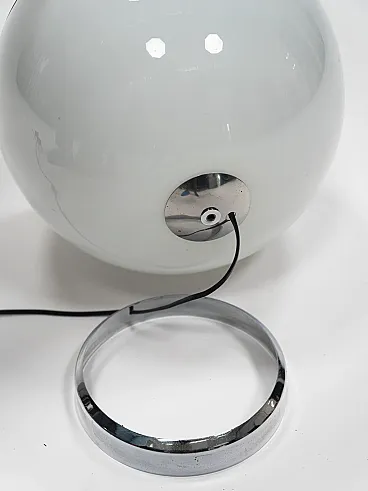 Like many of the best architects, Martini, Falconi & Fois also ventured into the design of objects. More alien than human, this particular table lamp in opal and chromium is their interpretation of the space era, and is spot on. The upper part, made of chrome, sees the partially chromed bulb embedded in a concave mirror that spreads a warm and diffused light by evoking images of reaction engines and intergalactic travel, while the lower part speaks of mysterious sparkling civilizations that we could meet out there. This lower part also lights up. Since the globe is separated from the round and chromed base, the lamp can be adjusted and inclined according to its desires.