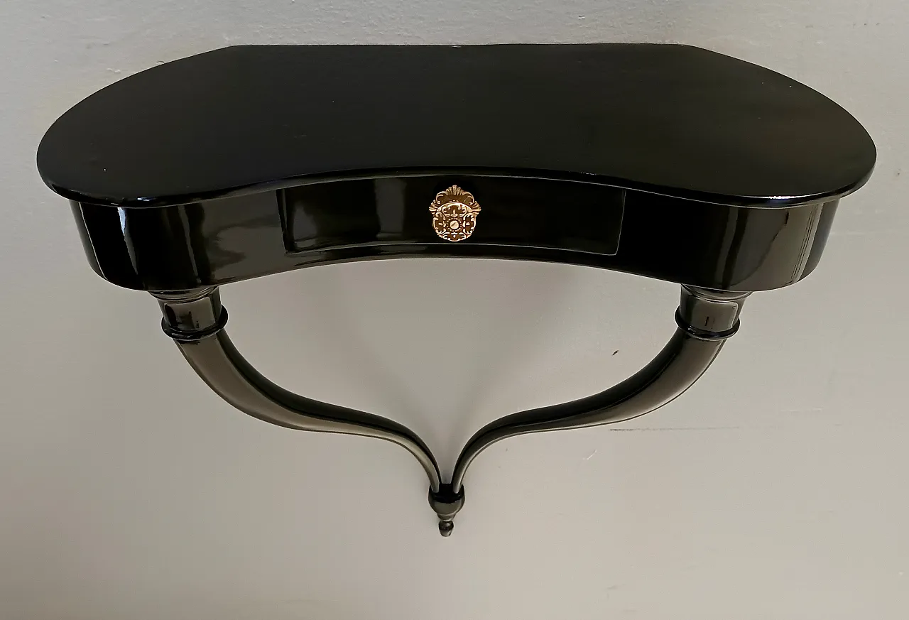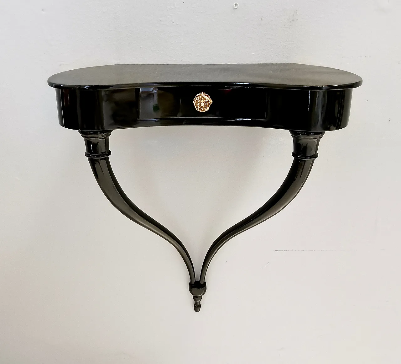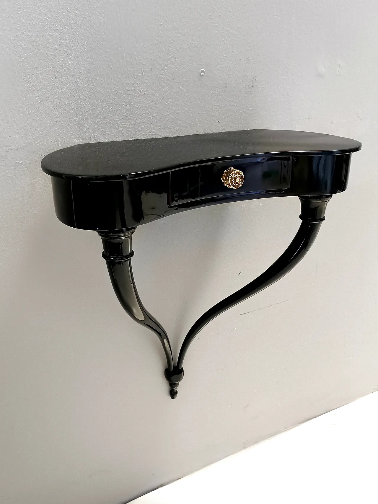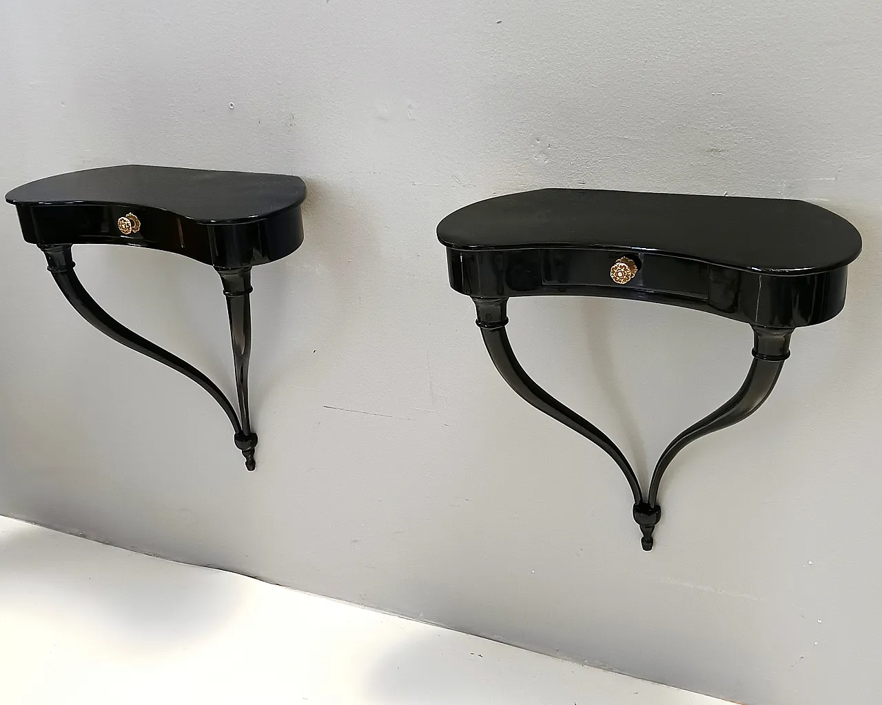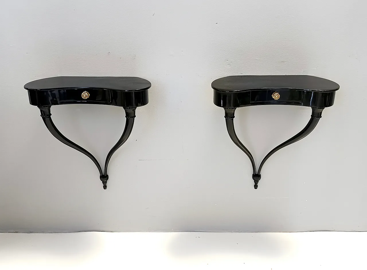 Made in Italy, 1950s. These wall-mounted console tables / nightstands feature a black beech frame with brass handles. Ulrich used this sinuous design also for wall lights and sconces. They might show slight traces of use since they're vintage, but they've been recently relacquered and can be considered as in excellent original condition and ready to become a piece in a home. Measures: Width 49.5 cm Depth 23 cm Height 55 cm. Order it now! We sell the best quality pieces and we offer an amazing service: if it's not during night time, we answer within 2 hours and we absolutely love to follow every step of the purchase and even after. As matter of fact we really appreciate our customers’ feedback and when we receive pictures of our pieces in their new homes. We assist you during the process and answer all your questions. In addition to this, we always review the pieces before shipping, so that you receive the goods at its very best. We provide the best possible quotes and professionally and carefully pack the items. Insurance is included. And if there is any issue, it is our mission to make so you don't have to worry: we will always be there for you to assist in any way possible.