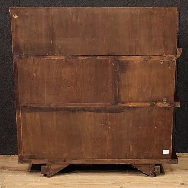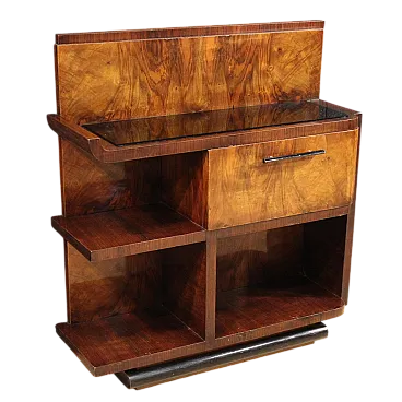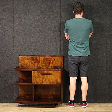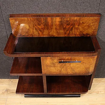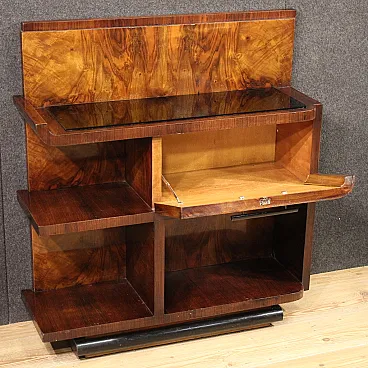 Elegant Italian cabinet of the mid -twentieth century. Art Deco Mobile Intempted Art Deco in walnut wood, rosewood, fruit and ebanized wood. Believe with top top in opaque glass upper top with some scratches / sign of wear. Small bookcase complete with 3 open rooms and an anti (see photo) of good capacity. Beautiful line cabinet and proportion that can be easily inserted in different points of the house, ideal for a stay. Structurally healthy, it has some small sign of wear, overall in good conservative state.