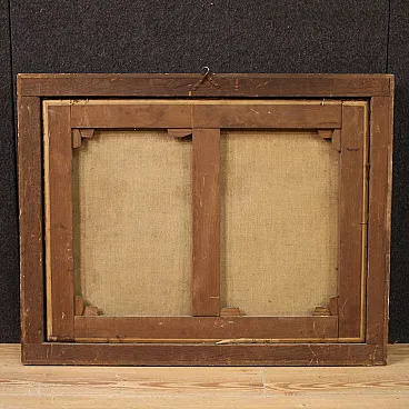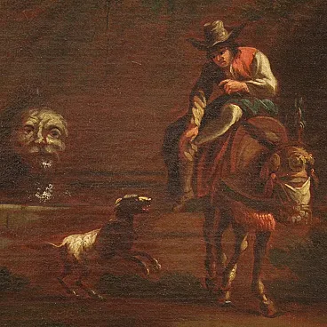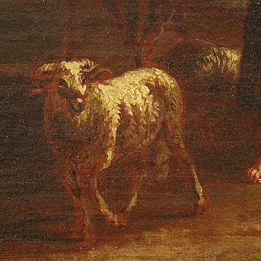 Roman school of the second half of the seventeenth century. Oil picture on canvas depicting a wonderful pastoral scene with figures and animals at the source. At the center of the painting we find a young lavender next to the ruins, an ancient fountain with which cows and sheep are drinking. On the right a man stands up a splendid donkey while a dog accompanies him. The type of composition, the naturalistic but idealized yield and the treatment of light refer to the Italian landscape of the late seventeenth century. Scenographic setting of the 19th century in carved and golden wood, with some signs of time. Work already restored with Rintelo, replacement of the frame and color recovery in small points, overall in good conservative state. Painting that is part of a pendant (see photos and request the price of the couple if still available). Painted light H 57.5 x L 76 cm.