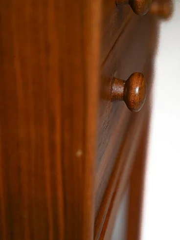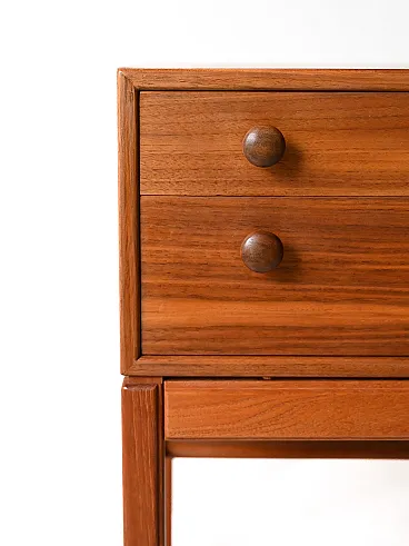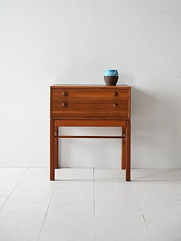 Original 60s table produced in Sweden. It stands out for the square floor and the presence of two drawers with wooden knobs. The modern lines and the marked vein of the wood make it an elegant piece of furniture and timeless beauty. Good condition. It may present signs of time. Pleasure pay attention to the photographs.