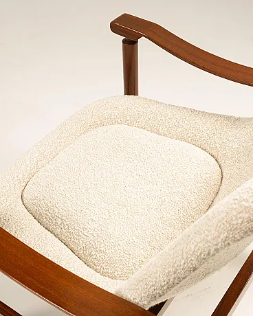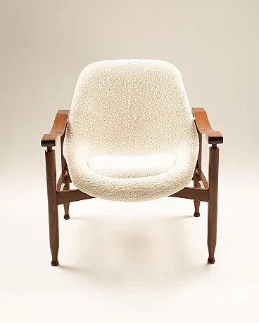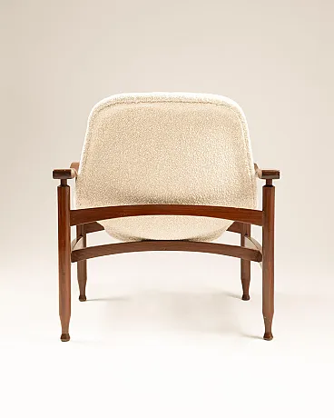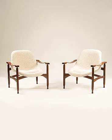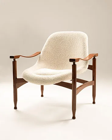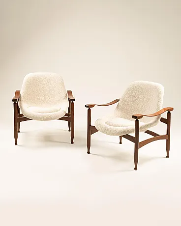 Pair of Italian Tiki armchairs - Busnelli Edition - Italy, 1960s Wooden frame, Plesten monocoque, restored foam padding, new textured fabric upholstery from Lelièvre Paris in white speckled with beige.