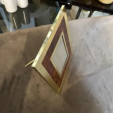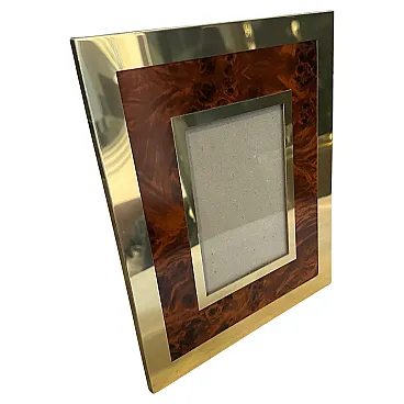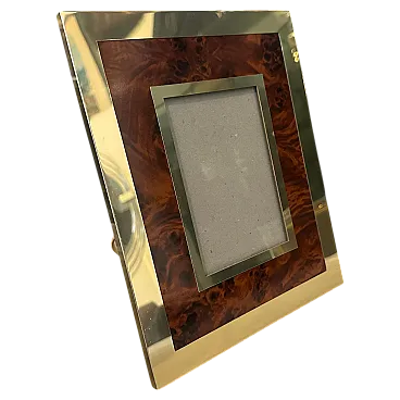 This Italian picture frame exudes elegance and sophistication. Crafted during the height of mid-century design, it showcases a perfect blend of luxurious materials and minimalist aesthetics. The frame boasts a sleek brass construction, a hallmark of mid-century design, which adds a touch of warmth and opulence to any space. The brass is meticulously crafted to emphasize clean lines and geometric shapes, capturing the essence of modernist design principles. Adding to its allure, the picture frame features an interior part made of fake walnut lucite , which infuses a sense of natural charm and texture. The rich brown tones complement the brass, creating a harmonious visual contrast that enhances the frame's overall appeal. With its rectangular shape, this picture frame offers a timeless and versatile design that effortlessly complements a variety of interior styles. This Italian picture frame not only reflects the style and craftsmanship of its era but also stands as a testament to the enduring allure of mid-century modern design. Its combination of high-quality materials and understated elegance makes it a timeless addition to any home or office decor scheme. The brass is in its original patina, while the lucite is in very good condition. It's in lovely vintage condition.