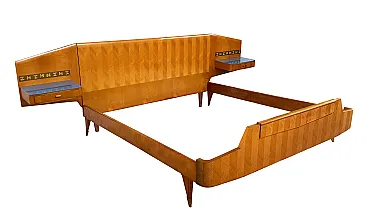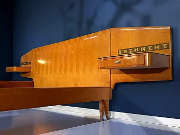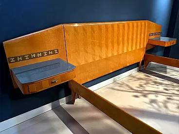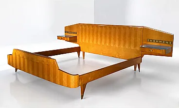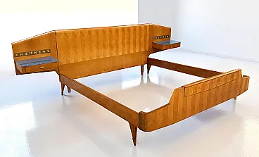This so well designed double bed flanked by two floating nightstands, is part of a rare and complete mid-century bedroom suite — which also includes a stunning vanity dresser with mirror (coming soon) and a magnificent six-door mirrored wardrobe (available now in a separate listing).