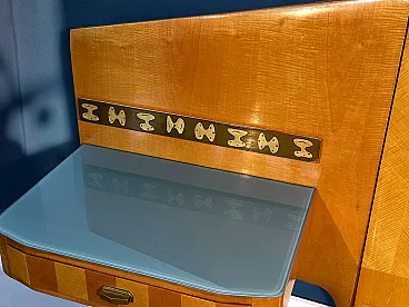 In this bed are stylistically recognisable and can be traced back to him, some and exquisite details in such as: the subtle yet sophisticated pairing of pale blue-grey glass shelves on the floating nightstands with the warmth of golden maple wood, and the thin hand-decorated ceramic strips placed above the glass, in addition also the graceful sculptural brass accents — as well the drawer handles or the elegantly tapered geometric legs of the bed frame.