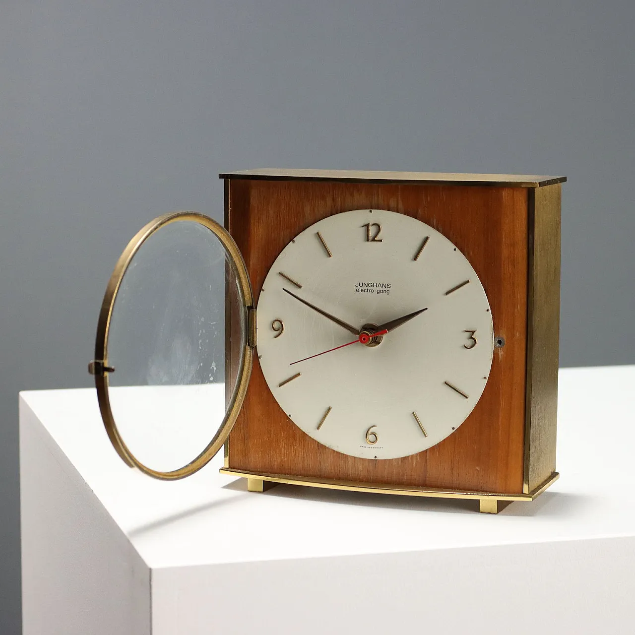 Table clock with wooden and brass case. Dial covered by a concave glass door with a bronze frame. Arabic numeral hours. Battery operated.
