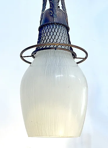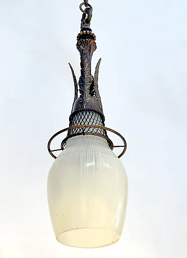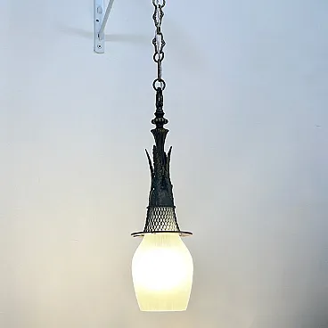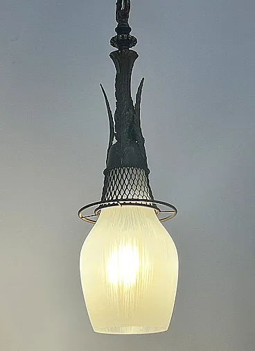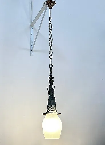 Small Dutch chandelier in bronze and white striped glass dating back to the early 1900s. The upper part of the chandelier is very particular with 3 leaves, net and external circle. Vintage piece of furniture suitable for an entrance, a small bedroom or study, a bathroom. The chandelier is in perfect condition (see photo). The chain is brass. The electrical system has been rewired with a new ivory-colored braided cable, the lamp holder is original. It has a light bulb with an E27 socket (not included). The body of the chandelier is 50 cm high + the chain