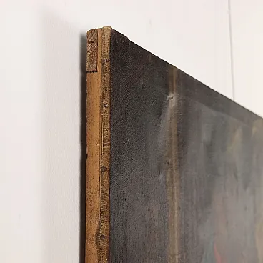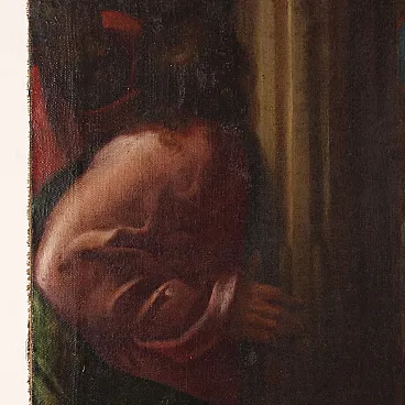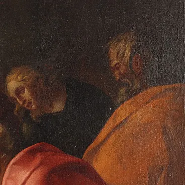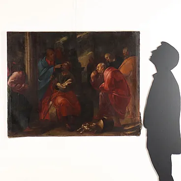 Oil on canvas. The scene tells the evangelical episode of the healing of the man born blind by Jesus. At the center of the scene, Jesus is performing the miracle, touching the eyes of the man, who shows his faith with an attitude of prayer, as narrated in the Gospel of John: "Jesus spat on the ground, made mud with the saliva, spread the mud on the eyes of the blind man and said to him: «Go wash yourself in the pool of Siloam». He went, washed and came back seeing." The supporting characters are particular: on the left some figures spy on the event, hidden behind a column; on the right the group of apostles in the second line can be recognized by their physiognomic features Peter and John -, while a man in front of them observes the scene through a magnifying glass: This instrument usually symbolizes the spirit of research, perhaps here the rational research that does not allow one to look with the eyes of faith and obtain the miracle. The painting has been restored and relined.