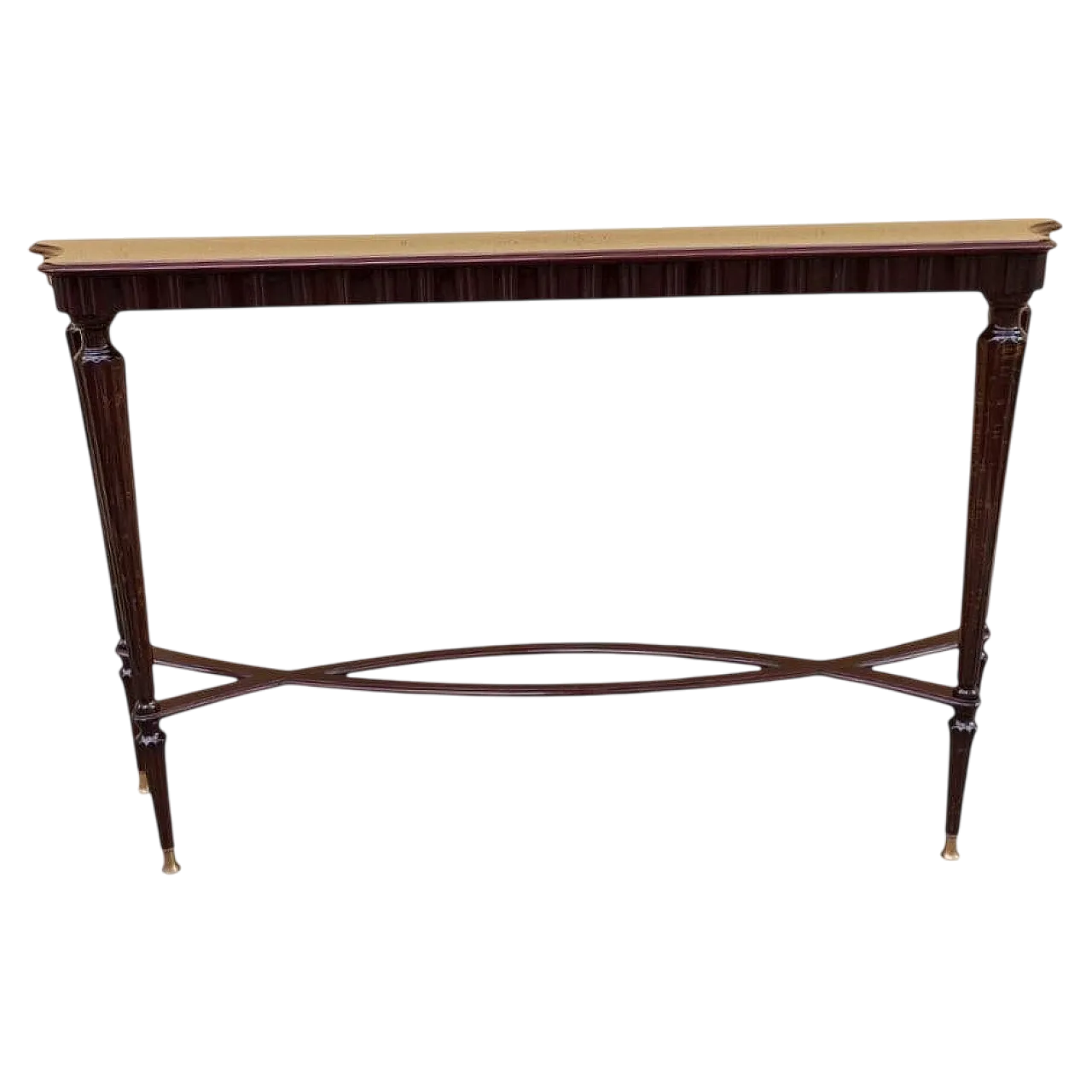 Elegant mahogany console table, featuring a refined design inspired by the style of Paolo Buffa. The frame is supported by fluted legs, while the underlying band features a crisscross pattern, a distinctive element that enriches the aesthetic harmony of the cabinet. Bronze feet add further elegance and stability. This console table, perfectly embodies the sophisticated taste and attention to detail typical of Italian design of the period. It is also equipped with a riser, as seen in some photos. Size: Width: 152 cm; height 92 cm; depth 33 cm.
