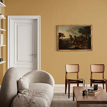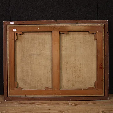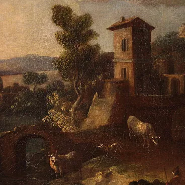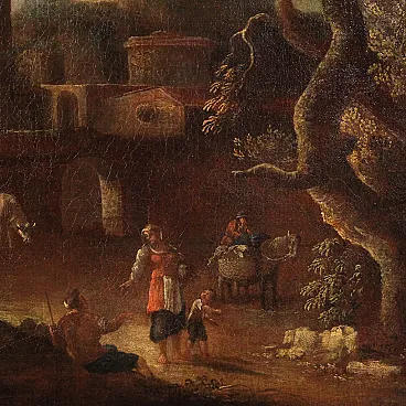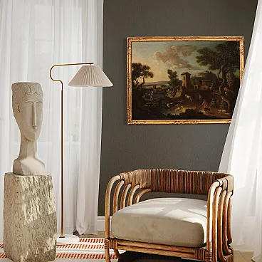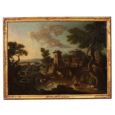 Ancient Italian picture of the second half of the seventeenth century. Oil work on canvas depicting a wonderful bucolic landscape with village, popular figures and past animals. With a balanced use of perspective plans we find in the foreground a family of farmers and a loaded mule led by a wayfarer through the bridge. On the right we see a large tree that thanks to the typical Repousoir mechanism guides our gaze towards a splendid village. The warm and twilight colors dominate the composition in a game of light and dark mastery. Framework of remarkable pictorial quality that recalls the great tradition of Italian and Flemish classical landscape of the seventeenth century. Cake of the 20th century in carved and golden wood, with some signs of the time. Work already restored with Rintelo, replacement of the frame and color recovery in some places. Overall in good conservative state. Painted light H 72.5 x L 98.5 cm.