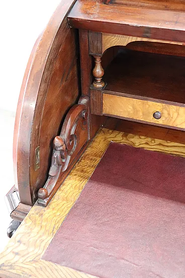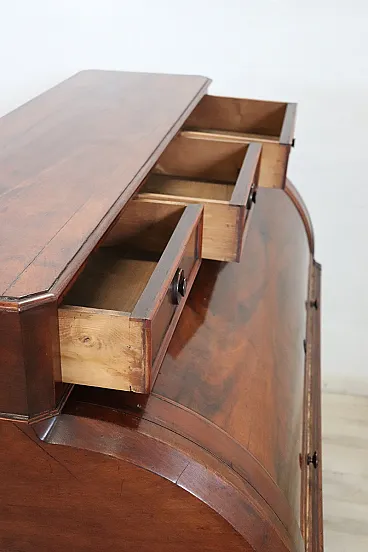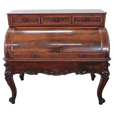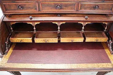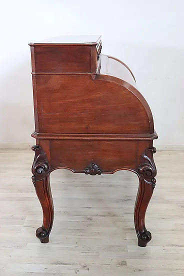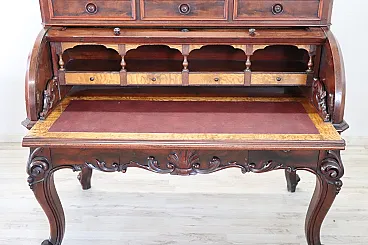 The desk is made of precious walnut wood, its line is wavy and fluid, with wavy legs and finely carved with curl and volute decorations that give a fantastic effect of lightness. Its most particular feature is the writing plan that is discovered only when the front is opened with a simple roller mechanism. When the plan is open, you have a practical and elegant support for writing or consultation of documents, including four drawers ideal for small objects. On the front there are six other drawers to store small everyday objects. Consider that the desk has been designed to be placed also in the center of the room, so you will have a great versatility in the choice of its positioning.