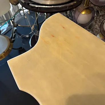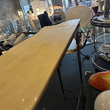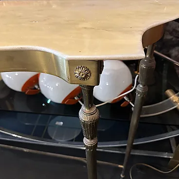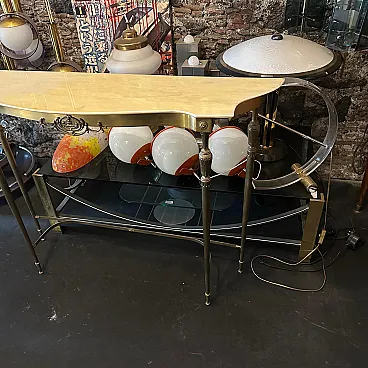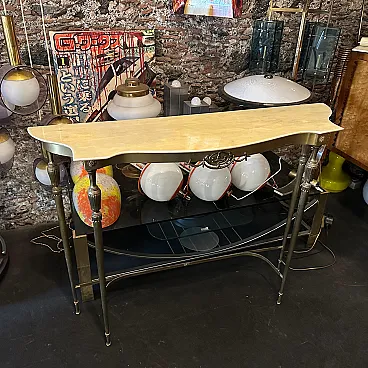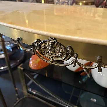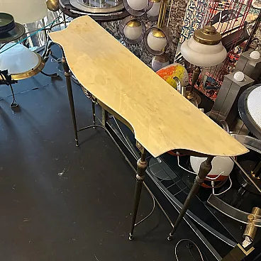 A 1950s mid-century modern with Neoclassical influences brass and onyx marble Italian console tables represents a unique and luxurious style characteristic of mid-20th century Italian design. This table features a combination of high-quality materials and elegant, classical design elements. The frame and legs of the tables are crafted from brass. Brass is chosen for its durability, weight, and the sophisticated sheen it develops over time. The brass is polished to a high shine, providing a luxurious appearance. The tabletop is made from onyx marble, a material valued for its translucent quality and striking veining patterns. Onyx marble comes in various colors and it has been treated to achieve this shimmering effect and yellow color. The legs are slender and tapered and feature decorative brass elements reflecting the classical influence. Additional details are brass medallions and other classical motifs that enhance the neoclassical aesthetic. This console table is versatile, often used in hallways, living rooms, or entryways. It provides a surface for displaying decorative items such as vases, sculptures, or lamps. It's in orginal very good condition and patina.