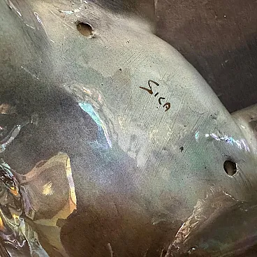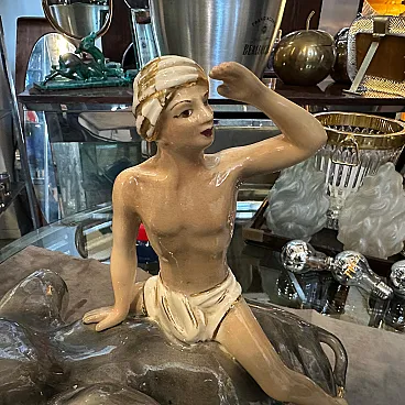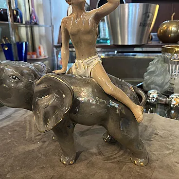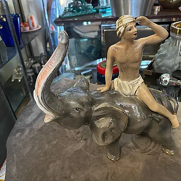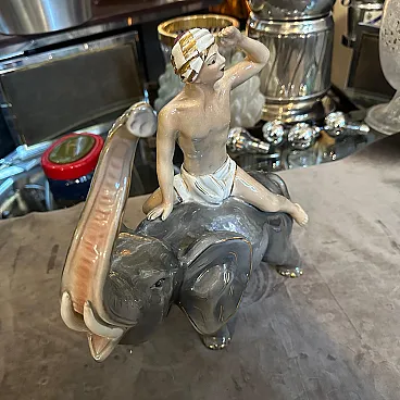 This captivating 1950s Italian ceramic figure, signed Sica " Società Italiana Ceramica Artistica ", presents a dynamic and exquisitely detailed scene. The piece depicts a slender figure of a boy seated atop a majestic elephant with its trunk raised high. The ceramic boasts a beautiful, iridescent glaze, particularly noticeable on the elephant's hide, which shimmers with subtle metallic hints of grey and bronze. Delicate gold accents further highlight the contours and details, such as the tips of the elephant's tusks and feet, and the headpiece of the rider. The figure's nuanced expression and the spirited pose of the elephant capture a sense of adventure and elegance, making this a truly distinctive and artistic representation from the mid-century Italian ceramic tradition. The figure is in lovely vintage condition.