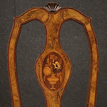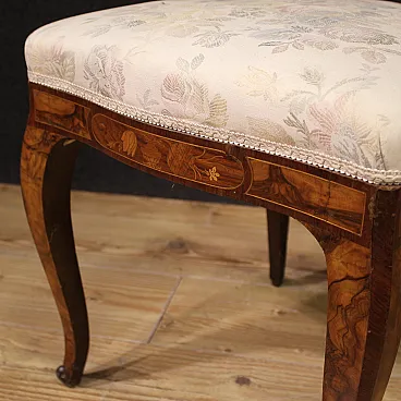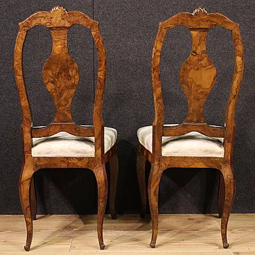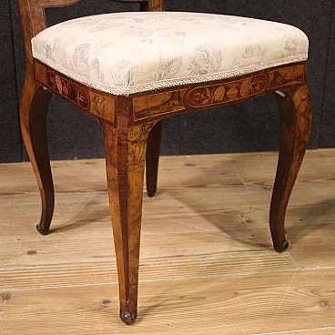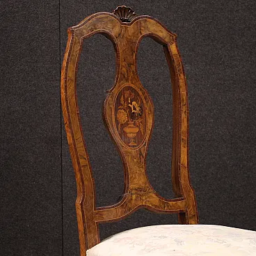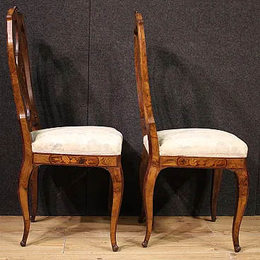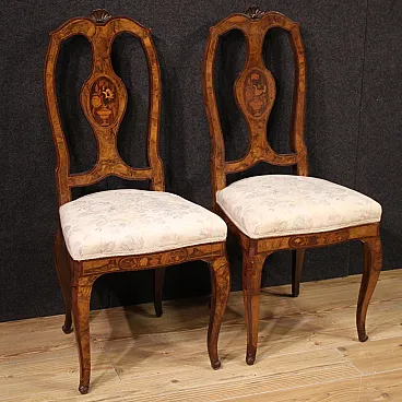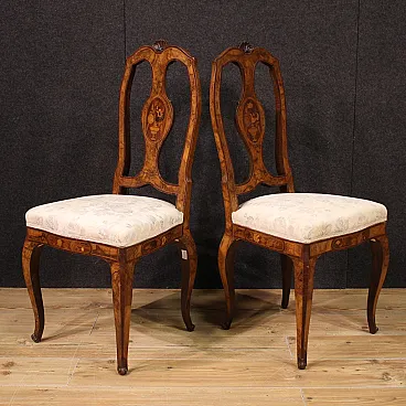 Pair of Italian chairs of the mid -twentieth century. Finely inlaid furniture with floral decoration on the backrest, veneered in walnut, root, bois de rose, maple, and fruit woods. Chairs supported by four solid legs with sessions covered in floral fabric without tears or spots, of good comfort. Height at the session of 50 cm. Ideal furniture to be inserted in a room or study, for antique dealers or furnishings. In good condition.