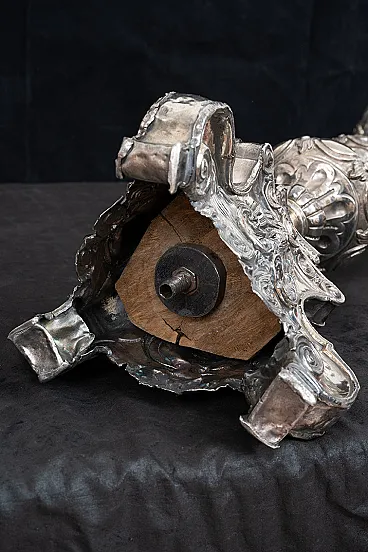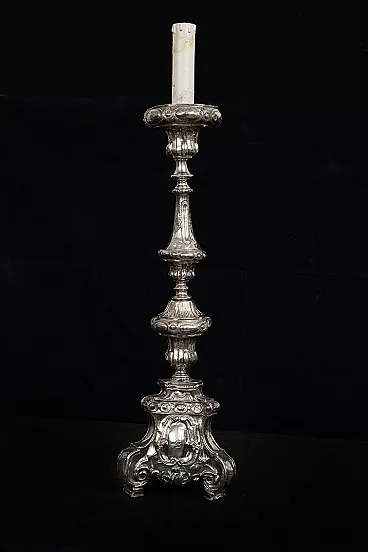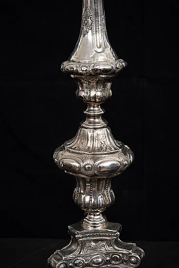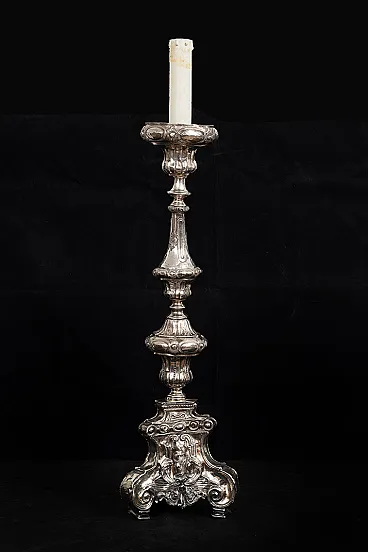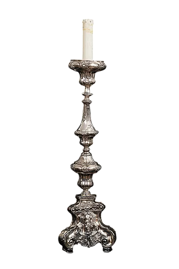 Description: Ancient antique candelabrum in silver bronze wisely chiseled belonging to the second half of the eighteenth century. The base is triangular in shape with a saint in the center alongside volutes with Rocailles motif. The central stem has a dense chisel with grooves overlooking circular elements with lateral pods. Origin: Italy XVIII century. Measures: 20x20 H60cm. Document: certificate of authenticity Assistance: we are at your disposal for further clarifications or photographic details Shipping: throughout Italy Europe and the rest of the world at very low prices in maximum safety and traceable. The shipment will be agreed privately and will not be high cost We wish you a good day Borrelli Antiquity.