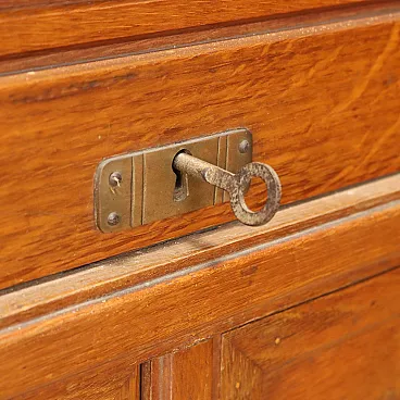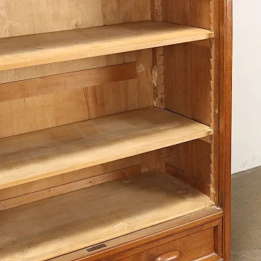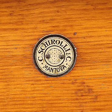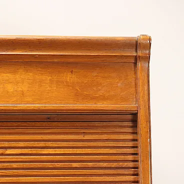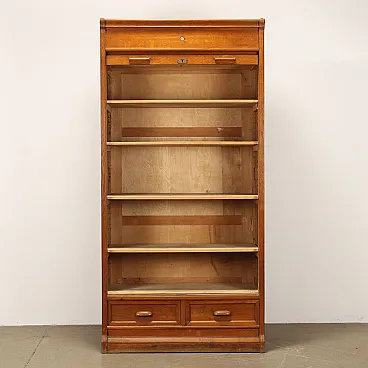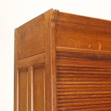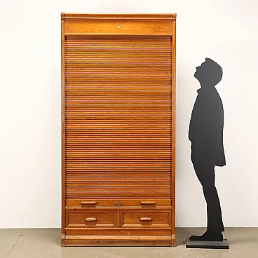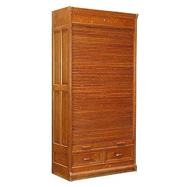 Oak roller shutter filing cabinet, five shelves in the central compartment and two drawers in the base. Made by C. Schirolli & C. Milan, first half of the 20th century.