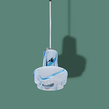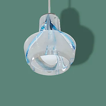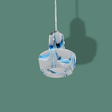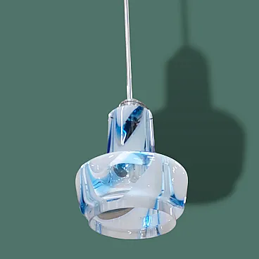 70s suspension lamp in Murano blown glass. Excellent conditions, no splinter or other of the glass. Original in every part, even in the electrical part. It can present mild signs of the time in the metal and plastic parts. Working. It has a light point. Bulb not included. Measurements: Height: 30cm Diameter: 24 Ø cm Total height with auction 50cm Material: blown glass, handmade in Murano Colors: blue-white-pansparent.