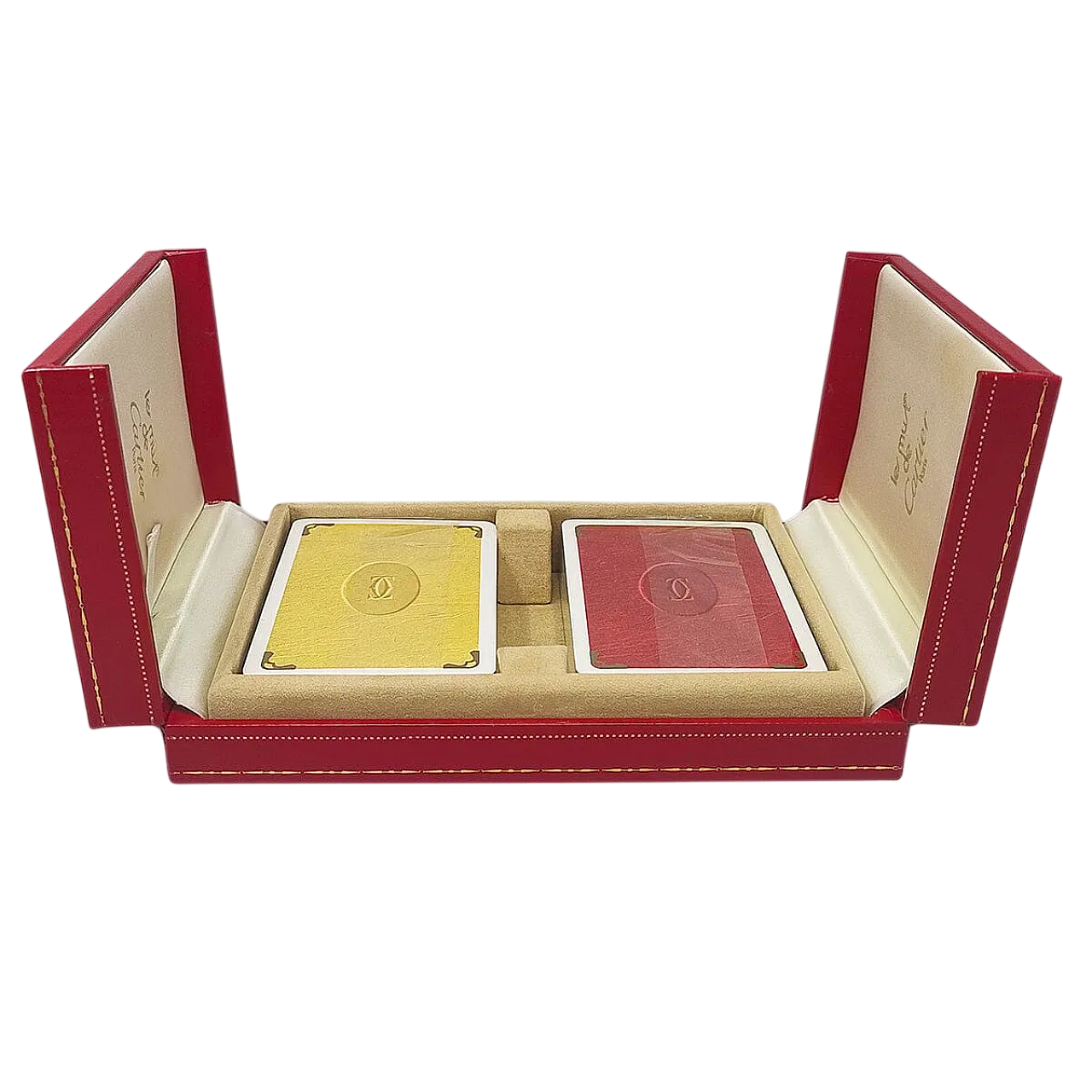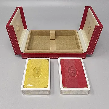 1970s Original Astonishing Playing Cards Box by Cartier with is red leather Original Box 2-Doors Case. The Box is Lined in Silk, Stamped with the Les Must de Cartier Logo and Includes Two Packs of Cartier Pocker Cards (Still Sealed). The must de Cartier Playing Cards Were Only Sold From 1972-1976. This set is Never Used, and is in Excellent Condition. Made in France. Dimension: 6.29 x 4.13 x 1.18 inches 16 x cm 10.5 x cm 3 h