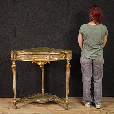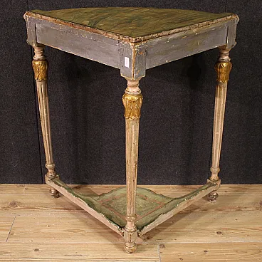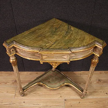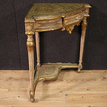 Italian angle of the mid -twentieth century. Sculpted, lacquered, golden and painted in style Louis XVI style, of beautiful line and pleasant furniture. Angoliera built in a single body, equipped with two lacquered support floors. Upper floor fake lacquered marble of good extent and service that has a transversal crack in the wood (see photo). Smaller lower floor, ideal for the display of a small pot with flowers. Furniture in beautiful patina, structurally healthy, supported by three sculpted and grooved legs, also lacquered and golden. With some sign of time, overall in good conservative state.