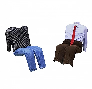 These incredible seats represent people comfortably seated on cushions. The articulated joints allow different positions. Structure in iron, wood, foam and fabric. They are dressed with suits and under overall. Possibility to dress them to your liking. The original brochure is not included.