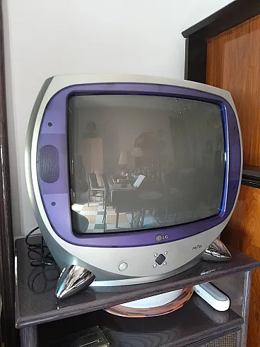 Beautiful and rare Space Age TV "LG", from the early 90s in a limited edition, gray and purple in color. When it was abandoned about 5/6 years ago it worked with the decoder very well, now I don't know, and it is sold as it is. The measures are: l.57 cm. P.47 cm. H. 48.5 cm. The screen: L.42 cm. x 31 cm. Collectible object. I evaluate reasonable proposals. I don't send. Withdrawal in Rome.