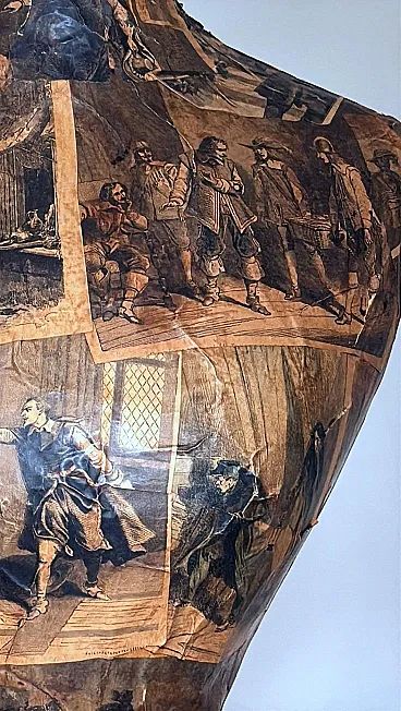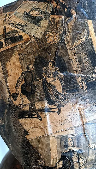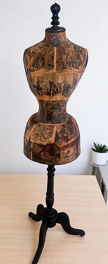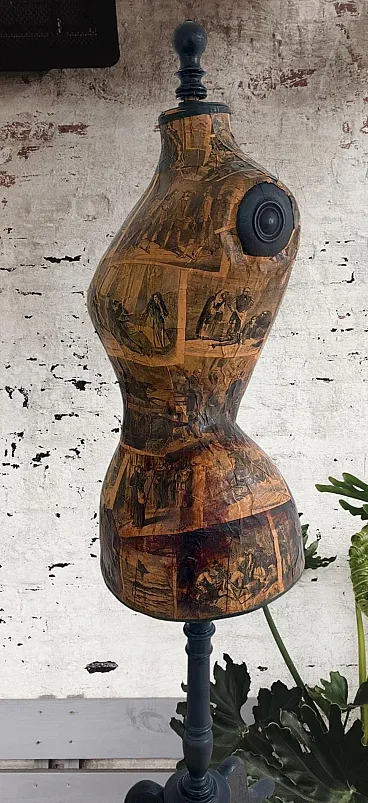 We kindly invite you to read the full description, as we strive to provide detailed technical and historical information to ensure the authenticity and value of our items. Exceptional French tailor’s mannequin dating from the second half of the 19th century, crafted from carved and turned wood. The figure features a stylized, life-sized anatomical structure designed to simulate the human body for tailoring purposes. Likely originating from a Parisian atelier, this piece is a rare example of functional sculpture—initially created for professional use, yet today highly valued as a decorative sculptural object in its own right. The patinated surface and finely handcrafted details reflect outstanding workmanship, with ball-jointed shoulders allowing for mobility. The torso is supported by a central column resting on a three-legged arched base, whose elegant, understated design is characteristic of French taste during the period. Mannequins of this kind were used in major fashion houses and tailoring studios in Paris for garment creation, fittings, and pattern adjustments. A distinctive feature of this particular example is the original torso covering, made from fragments of period newspapers and magazines, applied using a technique similar to decoupage—very popular at the time. Far from being purely decorative, this treatment also served a functional purpose: it reinforced the structure, protected the wood from wear, and gave the mannequin a “living” quality, evocative of the cultural and visual environment in which it was used. Some 19th-century French illustrations are still visible, likely sourced from illustrated periodicals such as Le Monde Illustré or La Vie Parisienne, providing valuable evidence of the item’s origin and provenance. Compared to 20th-century mannequins, this model features significantly more defined and naturalistic forms, with a well-shaped torso and hips in keeping with the aesthetics and demands of 19th-century haute couture. Originally used both for fittings and as a display support, this rare object today represents not only a piece of fashion history but also a refined interior design accent. Perfect for eclectic interiors, showrooms, creative studios, or collections related to fashion, historical design, and applied arts. The mannequin is in good overall condition. Dimensions: Height 155 cm, base diameter 50 cm (61 x 19.7 in.). We use professional packing materials (wooden crates, polystyrene, etc.) for all our shipments to ensure maximum protection and safety during transport.