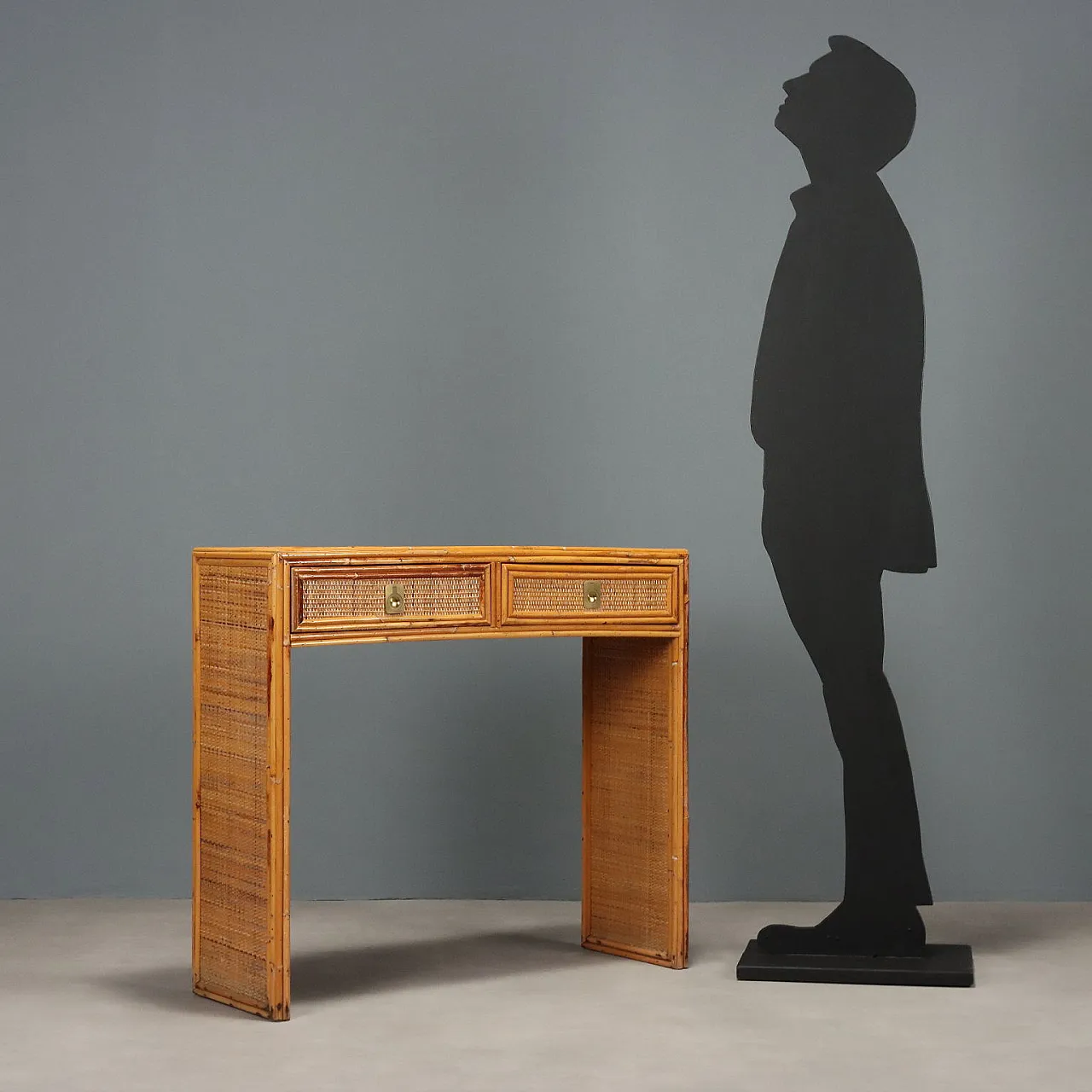 Vintage console table made of bamboo with two drawers under the top with brass handles.
