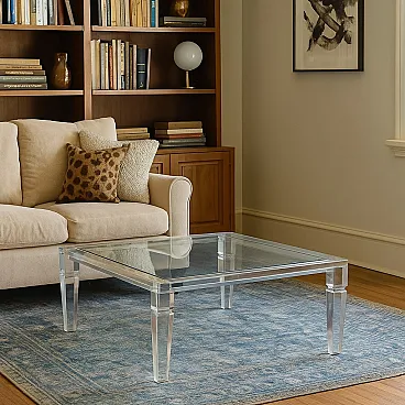 Coffee table with transparent plastic structure, square glass top.
