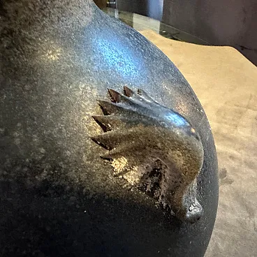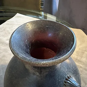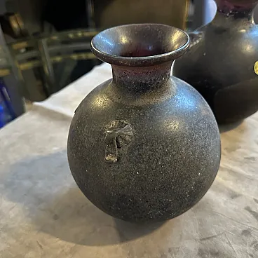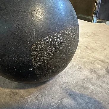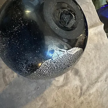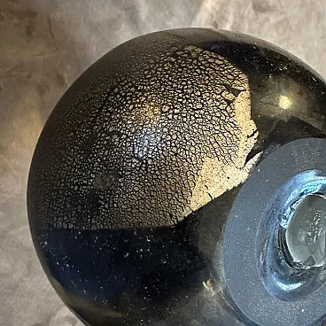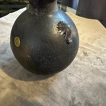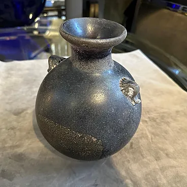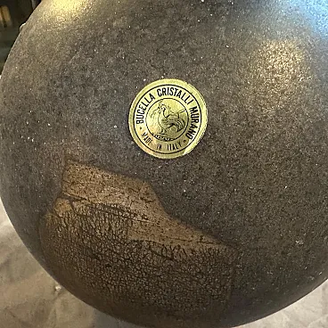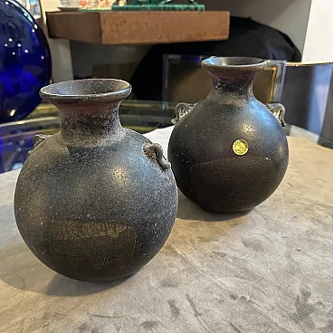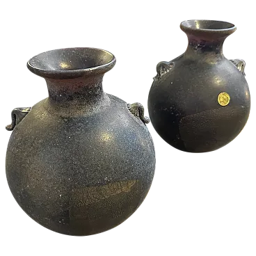 A pair of Modern Black and Gold Scavo Murano Glass Vases designed and manufactured by Bucella Cristalli in the Eighties. The two amphora vases have small handles. and decorative elements in a light gold. Scavo" Murano glass is a fascinating and distinctive technique that gives newly created glass pieces the appearance of ancient artifacts, as if they have been excavated from an archaeological site. The Italian word "scavo" literally means "excavation." The most striking characteristic is its rough, unpolished, semi-matte finish. This is achieved through a specific process, often involving chemical treatments or sandblasting. Scavo pieces often draw inspiration from classical antiquity, featuring shapes and forms reminiscent of Roman or Greek amphoras, vases, and other archaeological finds. the two vases are in perfect condition, they comes from a shop going out of business.