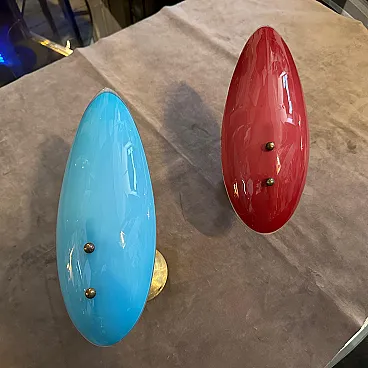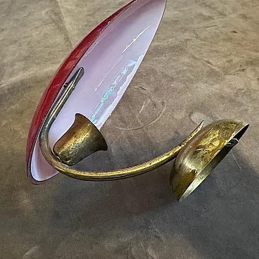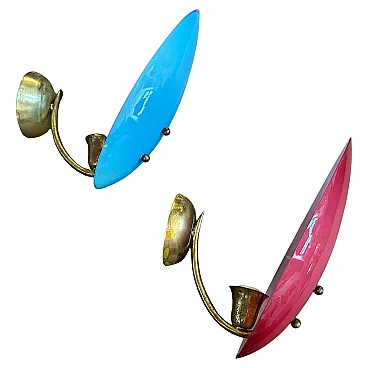 A Pair of 1950s Mid-Century Modern Italian Wall Sconces in Brass and Opaline Glass Add a bold splash of vintage Italian flair to your space with this striking pair of 1950s Mid-Century Modern wall sconces. Crafted from elegantly patinated brass and vibrant opaline glass, these sculptural sconces embody the playful sophistication of postwar Italian design. Each sconce features a gracefully curved brass arm supporting a petal-shaped opaline glass diffuser—one in vivid turquoise blue, the other in deep fuchsia pink—creating a dynamic, asymmetrical pairing that’s perfect for statement lighting. The eye-catching colors and sleek silhouettes make them ideal for entryways, living rooms, or bedside accents. Good vintage condition with minor wear consistent with age A rare and whimsical set for collectors and lovers of authentic Italian design, these sconces are sure to become a conversation piece in any interior, in working order and ready to install.