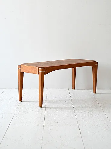 Panca scandinava originale degli anni ’60, interamente realizzata in teak con finitura calda e uniforme. The rake legs are connected to the floor by means of thin visible metal rings, a structural and decorative element that recalls Nordic minimalism. Il disegno è pulito, con profili smussati e proporzioni leggere ma ben equilibrate.