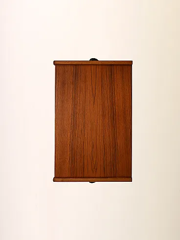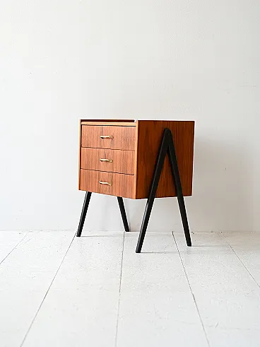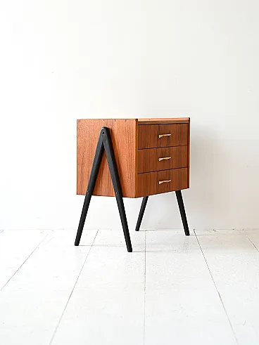 Vintage teak bedside table with three drawers, brass handles and black legs inclined by the graphic profile. Original Scandinavian bedside table of the 1950s, made of teak with three drawers with a linear front and shaped brass handles. The structure rests on inclined legs in black painted wood, arranged in a side stand that gives the piece a decisive and rhythmic character. A small furniture with compact proportions and modern spirit. Good condition. It may present signs of time. Pleasure pay attention to the photographs.