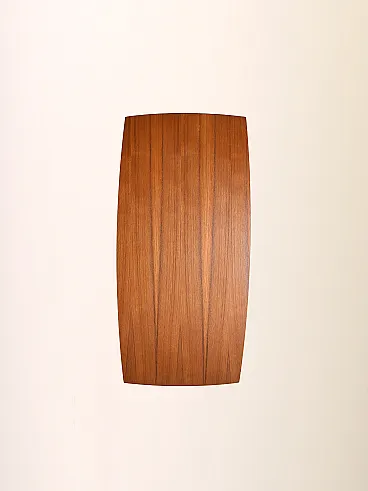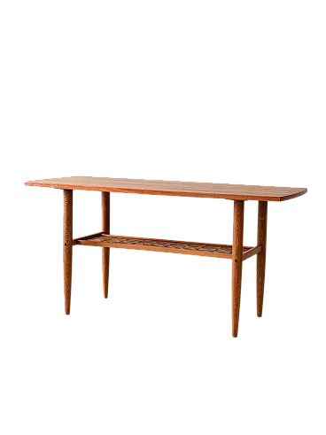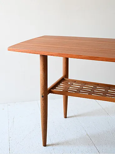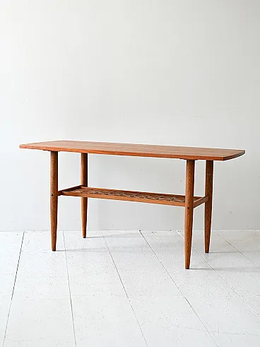 Teak table with tapered legs, taped top and woven shelf in orthogonal wood fiber. Original Scandinavian coffee table from the 1950s/60s, made of teak with rectangular top with blended edges. The structure is light, with tapered legs and balanced proportions. The lower shelf, woven with orthogonal jersey with wood fiber strips, adds functionality and an artisan detail to the sober drawing. Good condition. It may present signs of time. Pleasure pay attention to the photographs.
