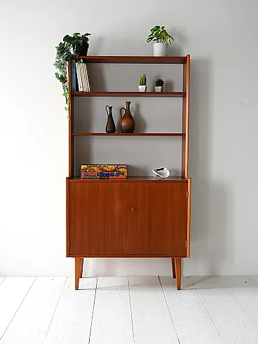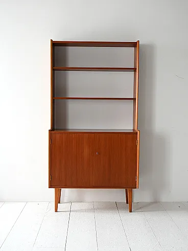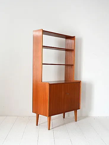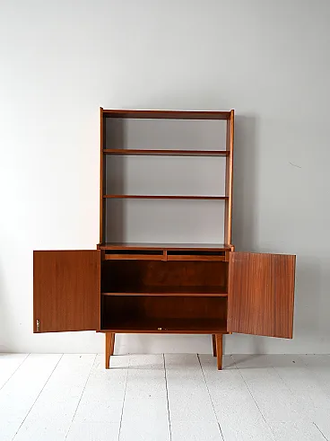 Vintage wooden library based on two doors, internal shelf and upper part with open shelves. Original Scandinavian library of the 1960s with wooden structure and slender lines. The lower part is equipped with two swing doors with an internal compartment and one shelf, while the upper one houses three open shelves. The composition combines functionality and visual lightness, with raked feet and well -calibrated proportions. Good condition. It may present signs of time. Pleasure pay attention to the photographs.