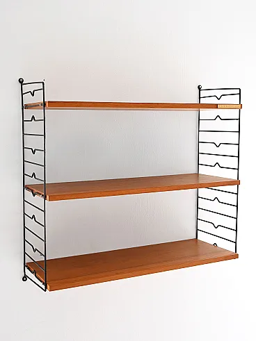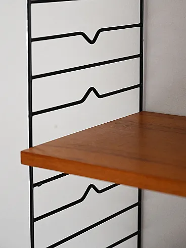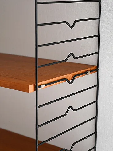Vintage wall system with adjustable teak shelves and black metal structure decorated with geometric motif.