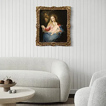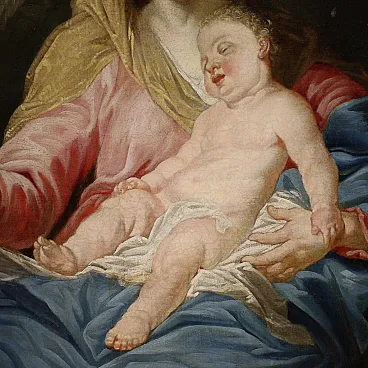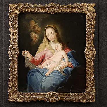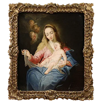 Splendid Italian picture of the eighteenth century. Oil painted on canvas depicting a wonderful Madonna and sleeping child, of considerable pictorial quality. For the delicacy of the Carnagioni, the calibrated use of chiaroscuro and the presence of refined cherubini the work is placed in the wake of the Rococo pictorial tradition. The composition with a pyramidal scheme shows a great sensitivity in the surrender of expressions and in the care of the drapery. Scenographic frame of the XIX in finely carved and golden wood, with some small shortcomings and retouches of non -original golden. Picture already restored with Rintelo, replacement of the frame and recovery of color in small points. Overall in good conservative state. Painted light H 75 x L 63 cm.