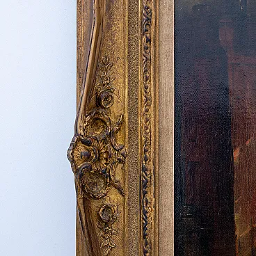 This fine old oil painting depicts two ladies seated in a 19th-century interior. Opposite the woman on the right is an old wool spinner; the woman pauses in her work to look up and smile at her companion, who is holding a letter. The scene evokes domestic harmony and happiness, a favorite theme of Portielje. The Belgian artist had a natural inclination for sensitivity in the portrayal of his models, as is evident in this intimate and thoughtful depiction of the two women. Edward Antoon Portielje (1861-1949) was an Antwerp artist who lived between the 19th and early 20th centuries. Portielje trained at the École des Beaux-Arts in Antwerp, where he studied with Charles Verlat, who also taught Vincent Van Gogh in the early 1880s. Portielje's work is distinguished by its refined, naturalistic style and the use of delicate brushstrokes that capture the finest details of the subject. The artist's skill is evident in this 19th-century painting, which expressively plays with light and tone to draw the viewer's attention to the two women in the center. Portielje skillfully illuminates the two seated figures through the use of lighter shades, while darker tones are present at the edges of the canvas. Framed in a beautiful carved and gilded wooden frame, the antique oil on canvas is signed "Edward Portielje" in the lower left corner. This work represents a unique opportunity to collect a painting by one of the most famous Flemish artists of his time. Canvas height 45 cm, width 56,5 cm With frame: height 64 cm, width 73 cm, depth 5 cm