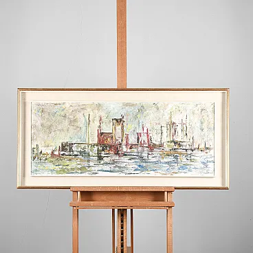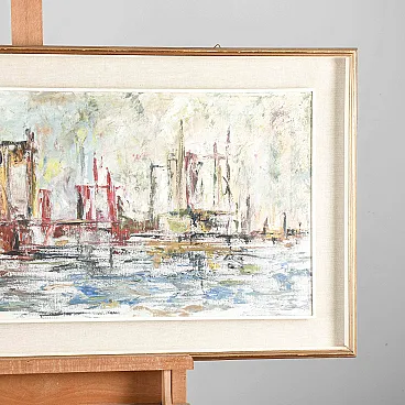 The abstract or semi-abstract composition, with the use of vivid colors and decided brush strokes, suggests a typical artistic exploration of the post-war period, making it a significant piece for collectors and lovers of the art of the twentieth century. The work is framed in a simple frame that enhances its content, allowing the observer to focus on the artist's visual language. The date and signature add value and authenticity to the piece, witnessing its origin and origin. A professional restoration has maintained its beauty. Ideal for enriching a modern or contemporary environment with a touch of vintage art, this picture is an opportunity for lovers of the modern antiquity of having an original work, capable of giving personality and a focal point of style to your home or office.
