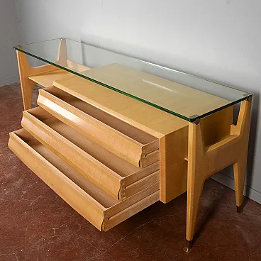 This dresser-cassettiera, attributed to Axi of La Permanente Cantù, is an exceptional example of modern Italian design, probably dating back to the mid-twentieth century. His minimalist aesthetic, combined with the use of quality materials and accurate processing, makes him a piece of great value for lovers of moderniating and author design. The furniture has clean lines and balanced proportions, with a glass top that adds lightness and functionality. The drawers, characterized by discrete handles, offer ample containment space, making it a versatile element for a bedroom or living room. The excellent state of conservation testifies to the quality of materials and execution. Ideal for those looking for an iconic piece of Italian design that combines functionality and refined aesthetic, this dresser-cassette is a unique opportunity to enrich their home with an element of great prestige and a touch of timeless elegance.