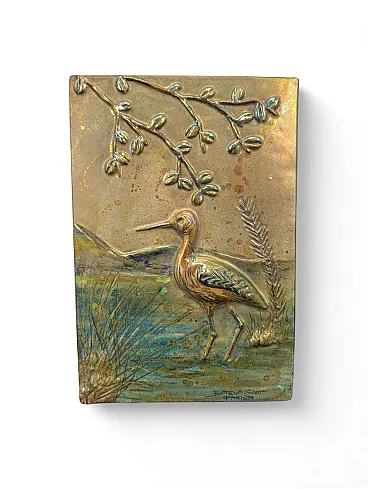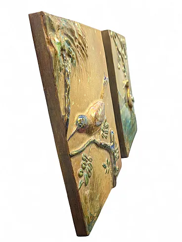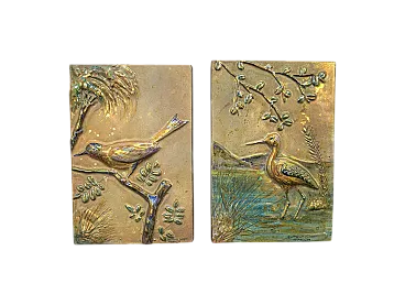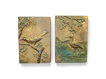 The first plaque shows a small bird laid on a branch, surrounded by delicate leaves and tufts of grass moved by the wind. The second represents a wck, probably a heron or a chiurlo, in a lake landscape, with marsh vegetation and a flowery branch that frames the composition.